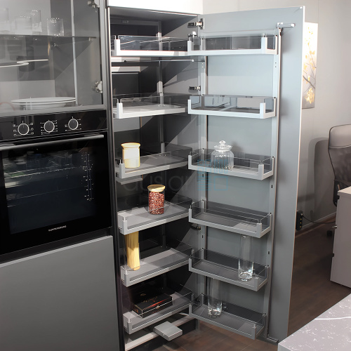 • Выдвижная колонна в стильном исполнении с боковинами из тонированного стекла подойдет для кухонь в любом стиле и придаст интерьеру современный внешний вид.