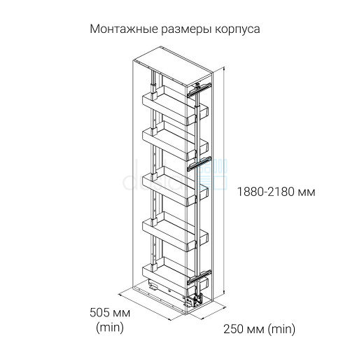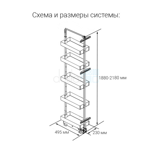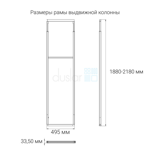 • Размер изделия с учетом направляющих и регулируемой рамы: ширина 230 мм, глубина 495 мм, высота 1880-2180 мм.