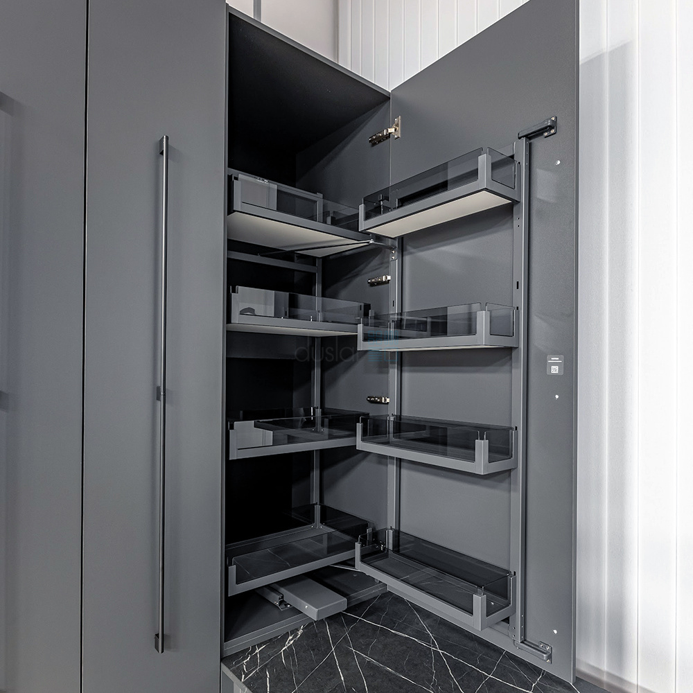 • Выдвижная колонна в стильном исполнении с боковинами из тонированного стекла подойдет для кухонь в любом стиле и придаст интерьеру современный внешний вид.