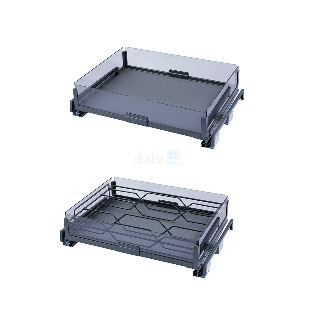 • Выдвижные корзины в стильном исполнении с боковинами из тонированного стекла подойдут для кухонь в любом стиле и придаст интерьеру современный внешний вид.