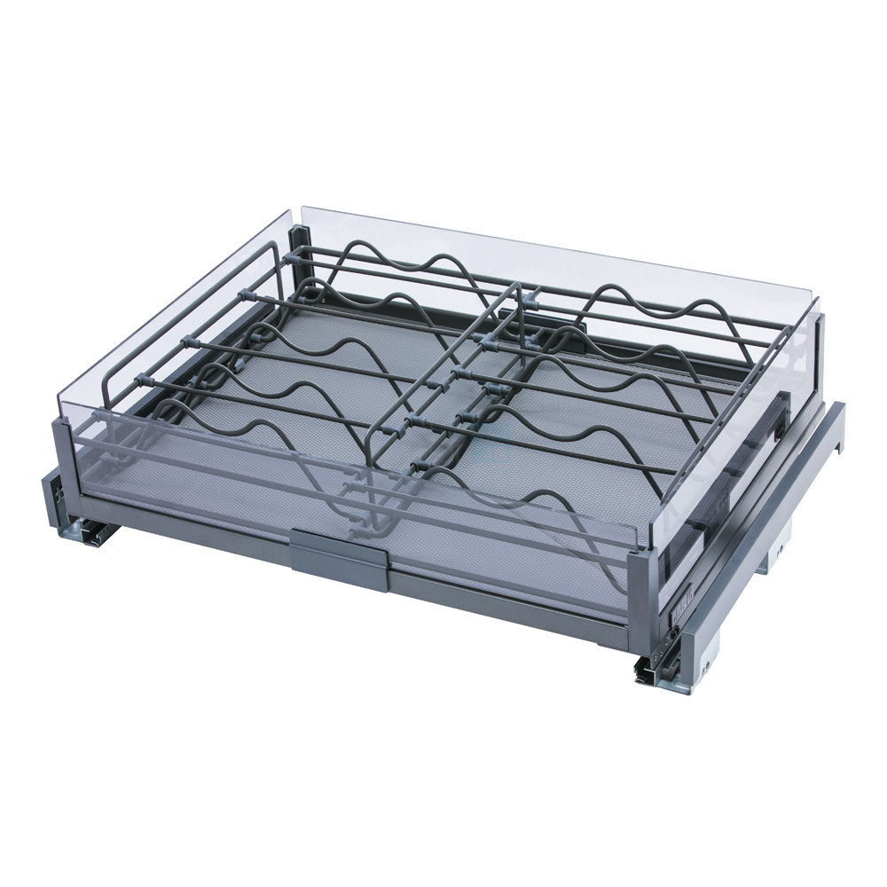 • Выдвижная корзина в стильном исполнении с боковинами из тонированного стекла подойдет для кухонь в любом стиле и придаст интерьеру современный внешний вид.