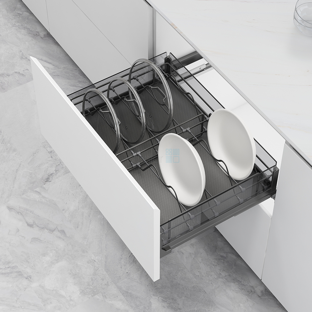 • Корзина с держателем обеспечивает удобное и компактное хранение крышек в нижней секции шкафа.