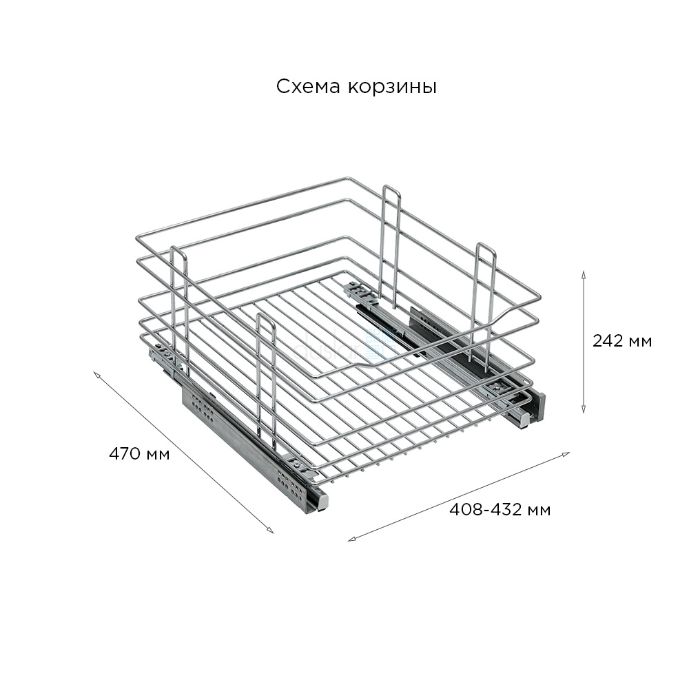 • Габариты корзины с направляющими: ширина 408-432 мм, глубина 470 мм, высота 242 мм.