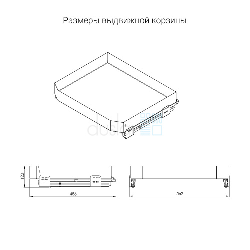 • Габариты корзины с направляющими: ширина 562-568 мм, глубина 486 мм, высота 120 мм.