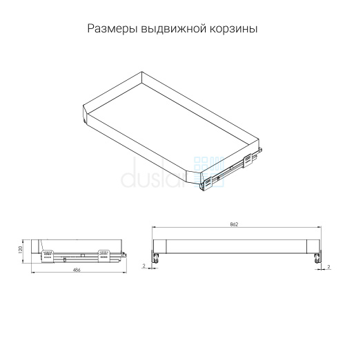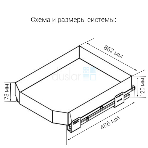 • Габариты изделия с направляющими: ширина 862-868 мм, глубина 486 мм, высота 120 мм.