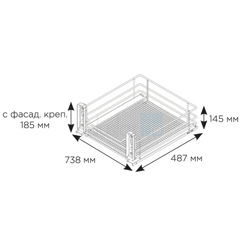 • Габариты корзины без направляющих: ширина 738 мм, глубина 487 мм, высота 145 мм (185 мм с фасадным креплением).