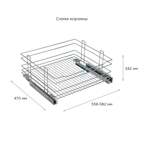 • Габариты корзины с направляющими: ширина 558-582 мм, глубина 470 мм, высота 242 мм.