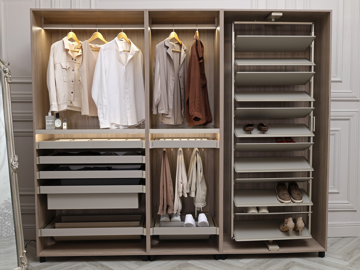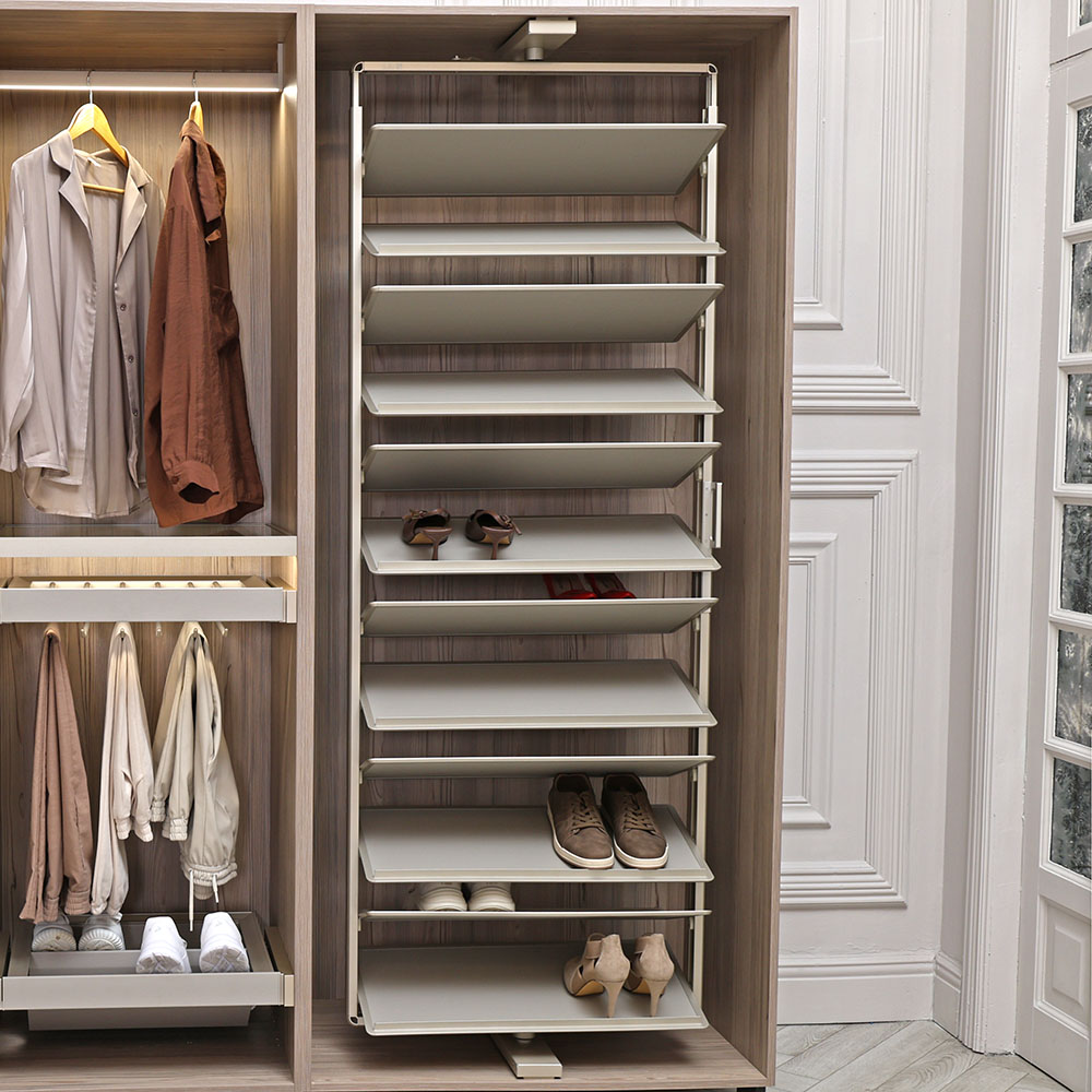 - Широкий размерный ряд. Системы для шкафов представлены на несколько ширин фасадов, что дает возможность функционально наполнить весь гардероб.